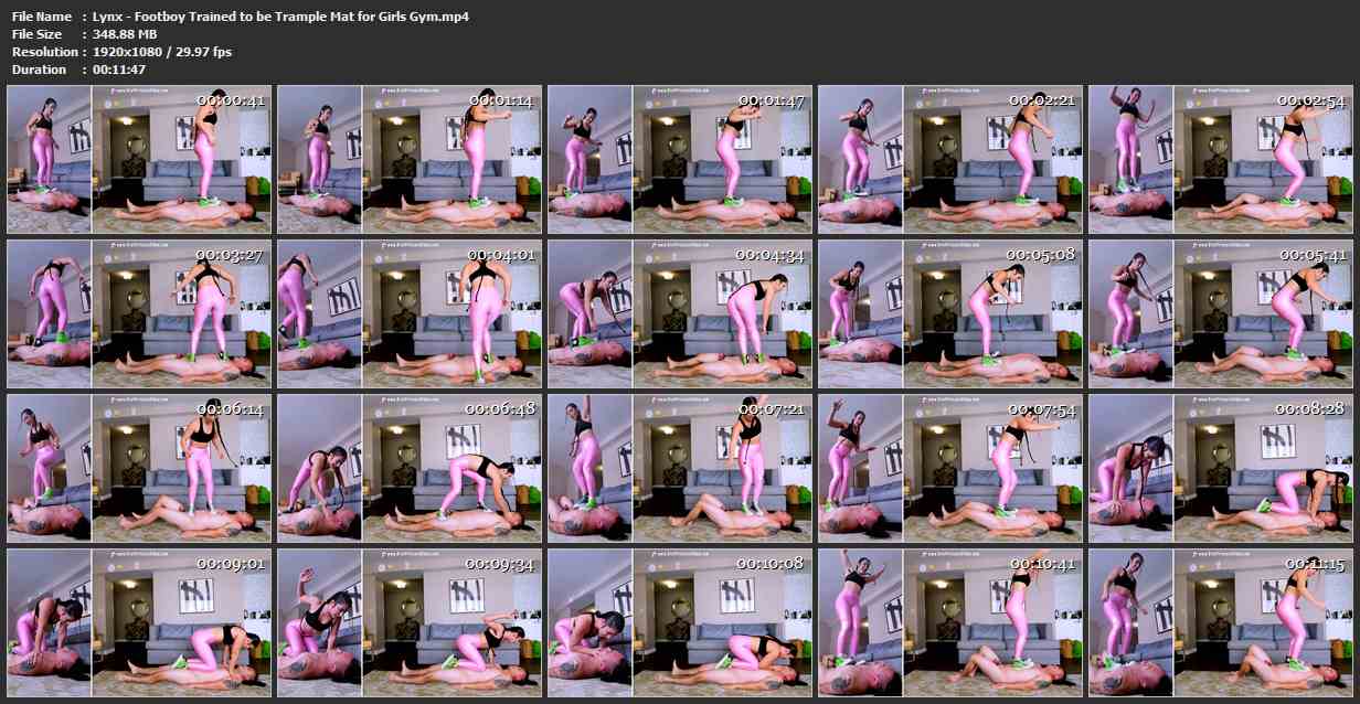 Lynx opened a super cool gym. Its a gym for ALL GIRLS. She can use this beta bitch by putting him to work at her gym. She can use him as an aerobics trample mat for the girls. Lynx shows him what his job is going to be like. They are going to stomp on him repeatedly! He is just a stupid mat whose only purpose in life is to be walked all over. Lynx gives him a few good face slaps to show him who is boss.