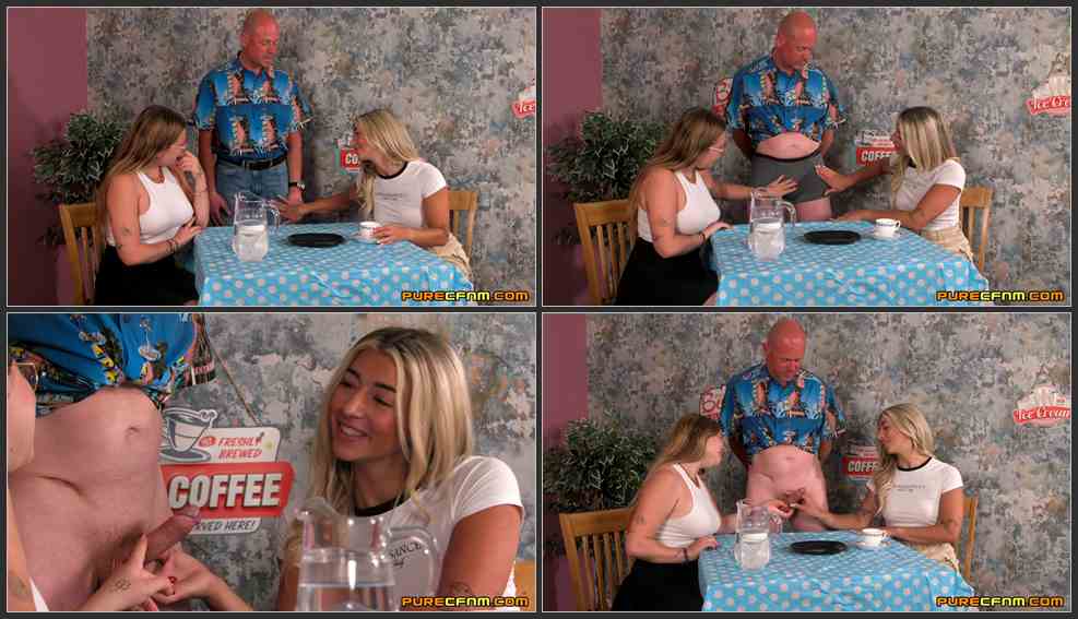 Rae is worried about how the new Online Safety Act in the UK will affect sales on her Only Fans. Her friend Ella assures her she has nothing to worry about. "Men will always need to jerk off" she says and then decides to prove it. She beckons over a fellow customer in the cafe and asks if she can touch his cock. He is shocked but, like any guy, eagerly says yes. The two girls happily grope the complete stranger, pulling down his pants and licking his penis until he ejaculates across the table!