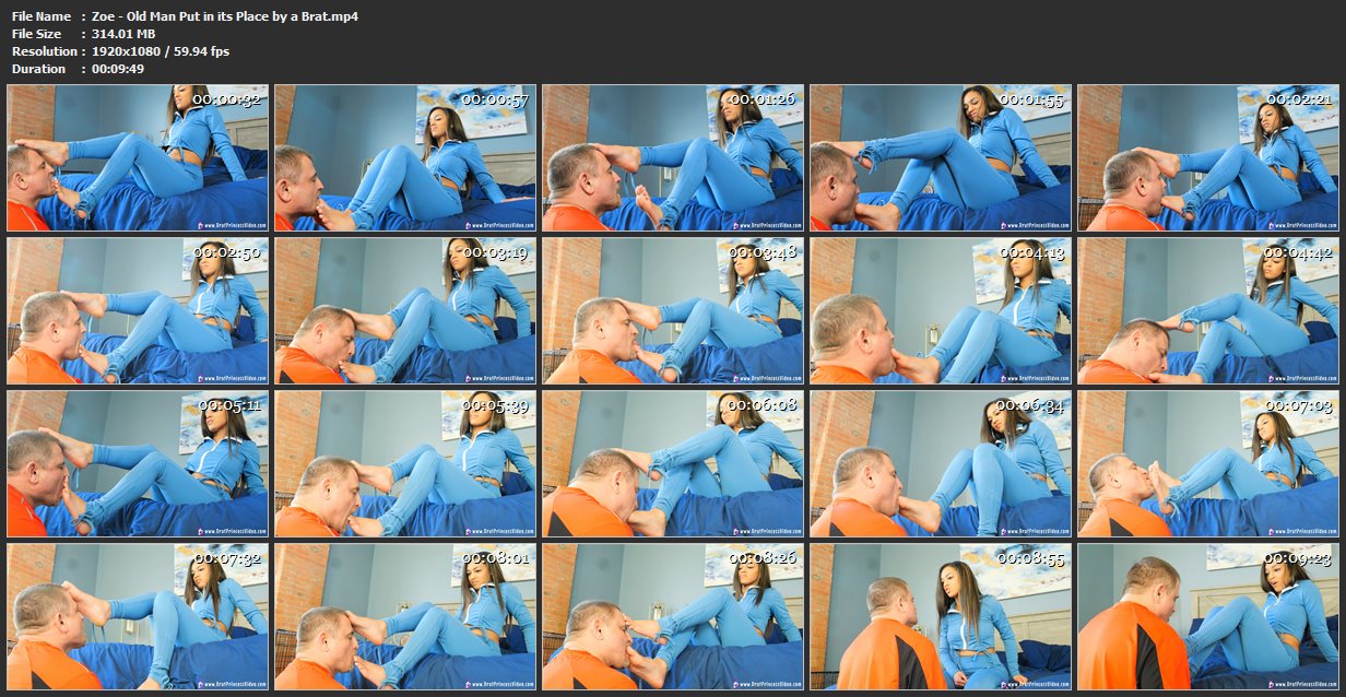 Zoe is such a brat. She laughs at this old man. She knows he will do anything for her. Her feet own him. She can use her feet to get him to do anything. She shoves her pretty princess toes in his mouth, making him lick the soles. She gags him with her feet and makes him suck her toes, getting in between each one.